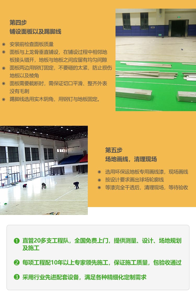 6.鋪設運動木地板:面板材質:均為A級B級較好的材的柞木.楓木.